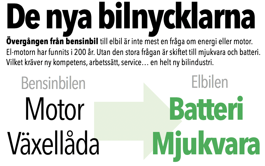 Men sanningen stavas ännu mer elektrifieringen, vilket kommer att kräva ny kompetens, organisation och samarbete på ett helt nytt sätt. Tänk alla tusentals delar till en bensinmotor, snart blir värdelösa. Vad ska alla underleverantörer göra då?