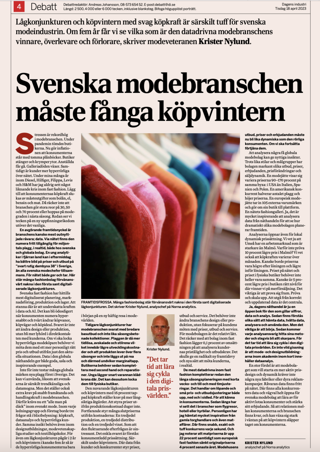 Särskilt i en konsumentbransch som mode kan AI vara nyttigt. Då inte bara i lager och produktion. Det skriver Krister Nylund Di, som menar att AI kan vassare och snabbare analysera priser, sortiment och löpande justeringar. Varje vecka, dag, stad, timme och till och med på konsumentnivå. För att nå den nya pressade och medvetna konsumenten.