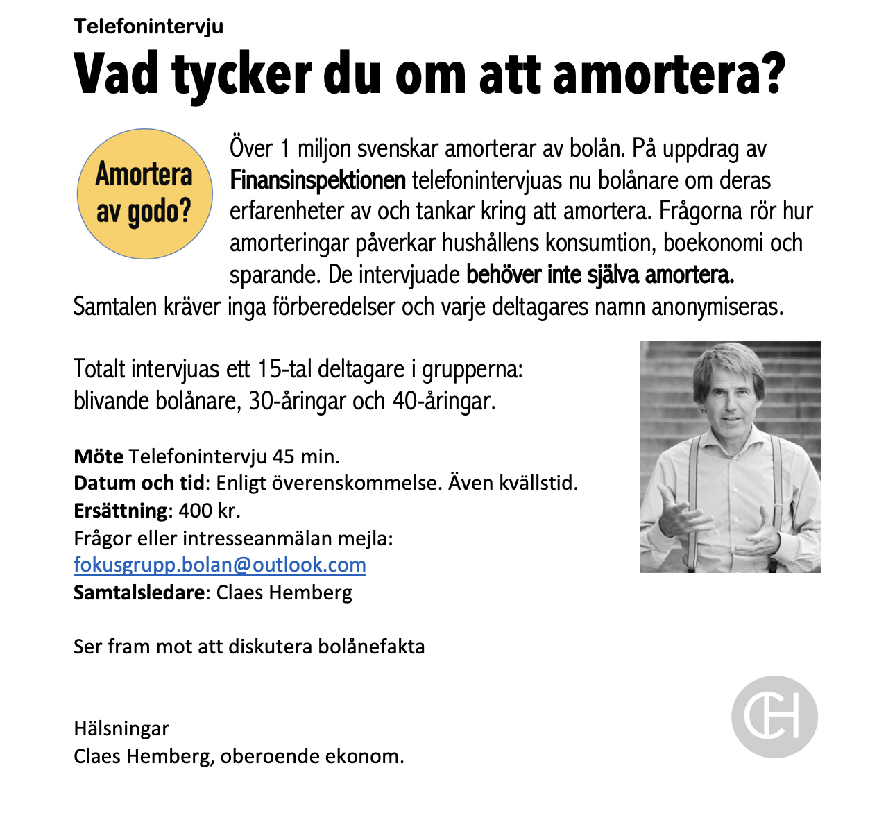 Nu vill jag telefonintervjua bolånare. Jag söker tre grupper: unga blivande bolånare, 30-åringar och 40-åringar. Över hela landet. Jag vill diskutera allt från behov, svårigheter, för- och nackdelar…