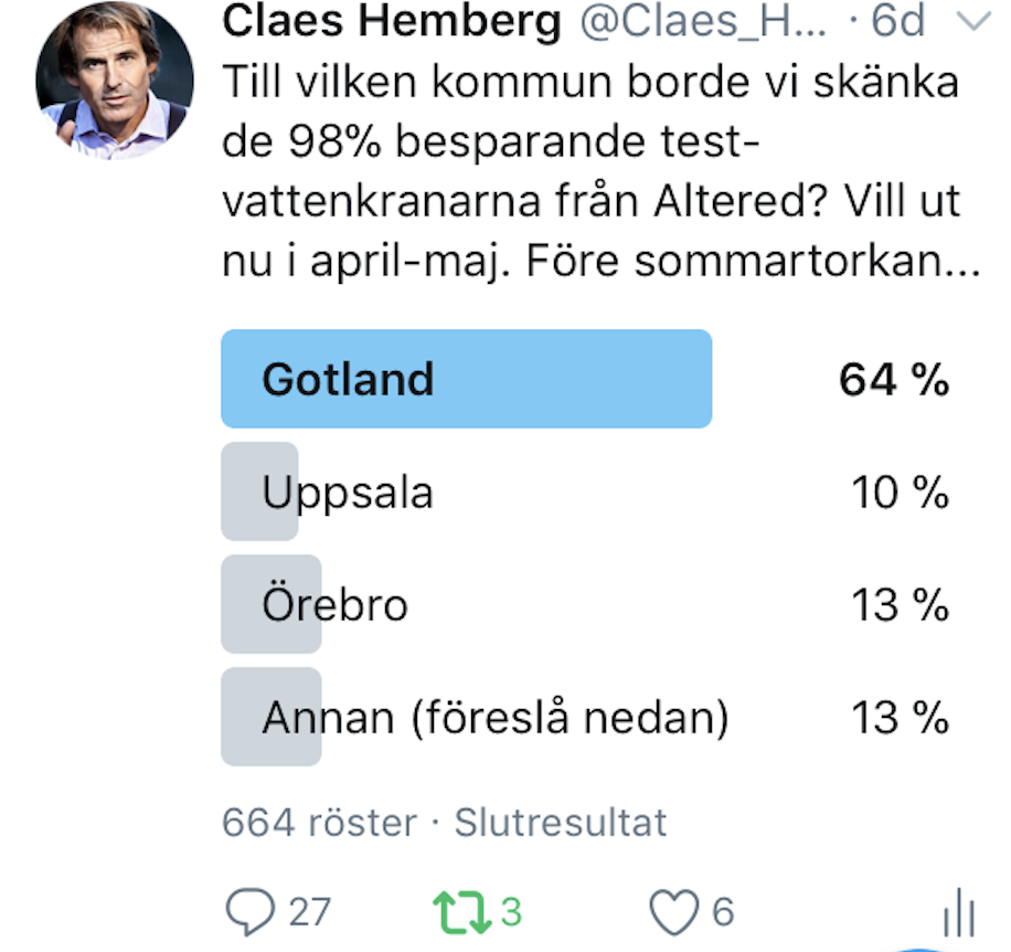 Två av tre säger att Gotland är bästa platsen att pröva ny vattenteknik och en seriös vattendebatt. En rad andra kommuner har också fått sina påhejare.Hultsfred, Norrtälje, Lund, Kungälv, Mörbylånga, Kalmar… Det är många städer vars medborgare vill se dem mer aktiva i vatten-debatten.