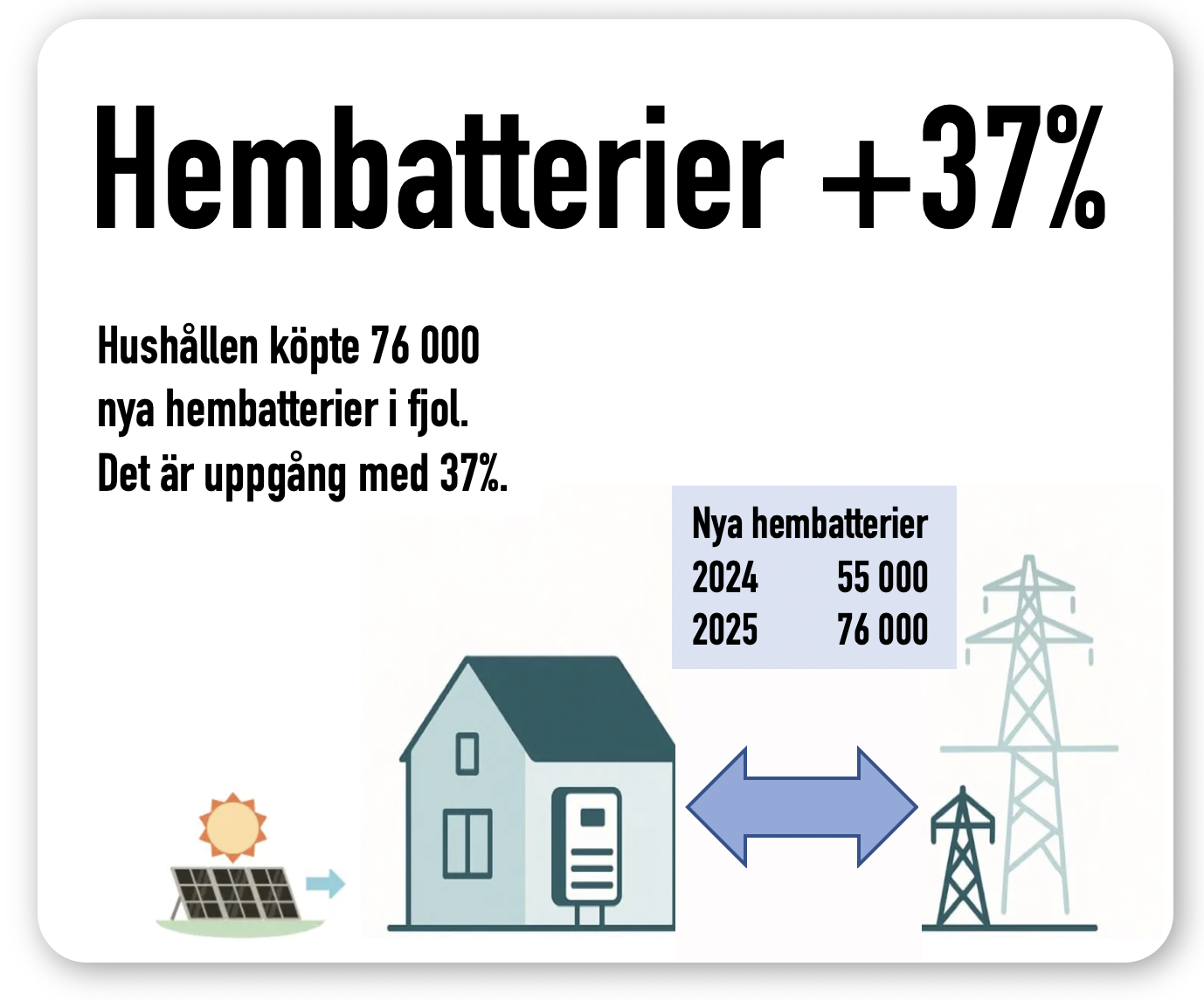 hembatterier växer 2025Hushållen med hembatterier växer snabbt. Bara senaste året har 76 000 hushåll tillkommit, visar SVT. Anledningen är prisras i stationära batterier, fler elbilar och solpaneler. Samtidigt som elen blivit dyrare.