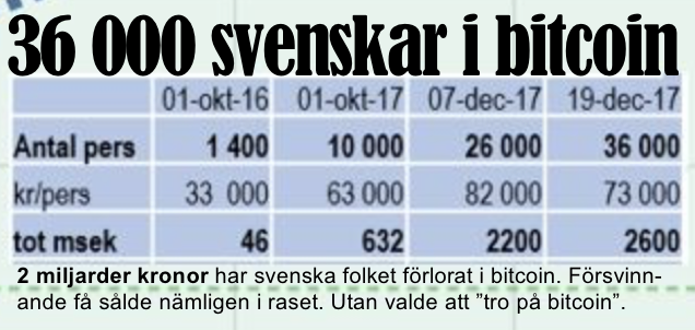 I Sverige fick kryptomanin kring bitcoin däremot mer dramatiska effekter. För svenskar var bland de först i världen handla den över börsen. Det gjorde den tillgänglig för många fler och tiotusentals gav sig in i leken. På bara några månader ökade antalet bitocin-börs-sparare från 1 000 personer till 36 000 i december 2017 och jag varnade i SVT Aktuellt.