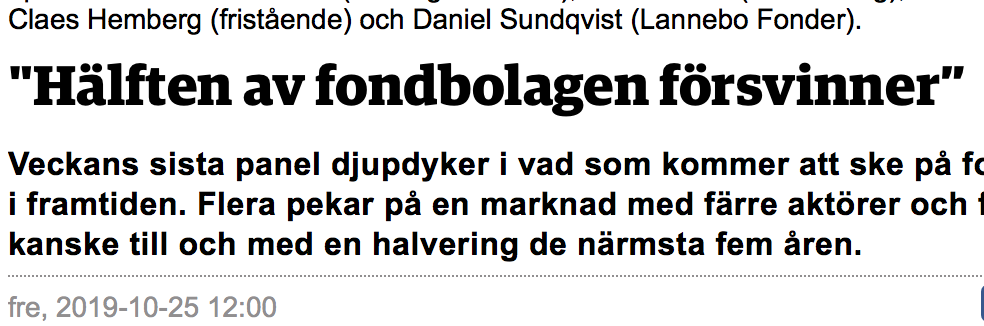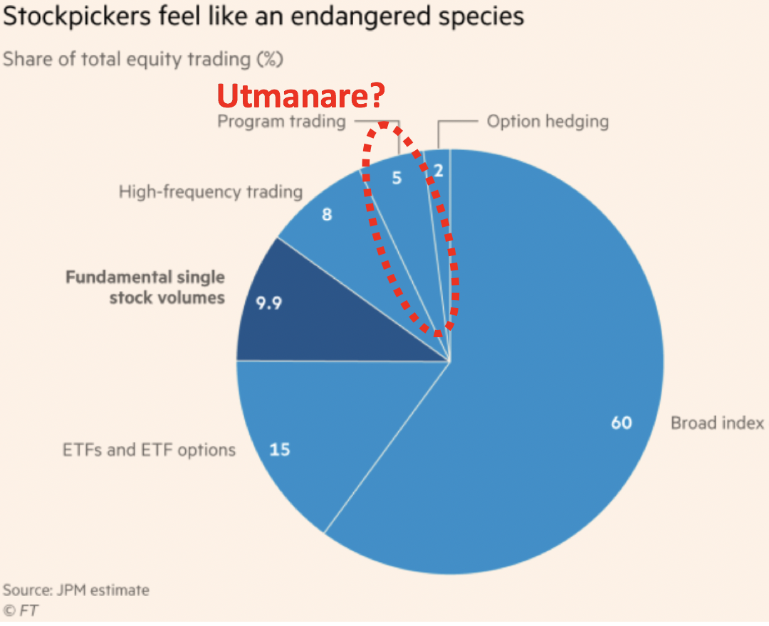Men bara en av tio fonder på amerikanska marknaden bygger idag på egen aktieanalys, säger FT i en analys. Det är en kraftig minskning senaste årtiondena. Och vi ser allt fler fonder stänga butiken. Även i Sverige har vi sett samma resa, när bara 1 av 20 aktiva fonder slår börsens snitt.