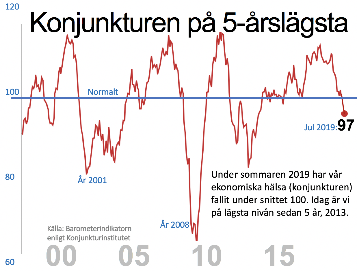 Under sommaren har Sverige gått in i lågkonjunktur, om vi ska luta oss mot Konjunkturinstitutets mätningar. Men detta är än så länge bara en siffra, som säger att det ekonomin växer sämre än snittet.