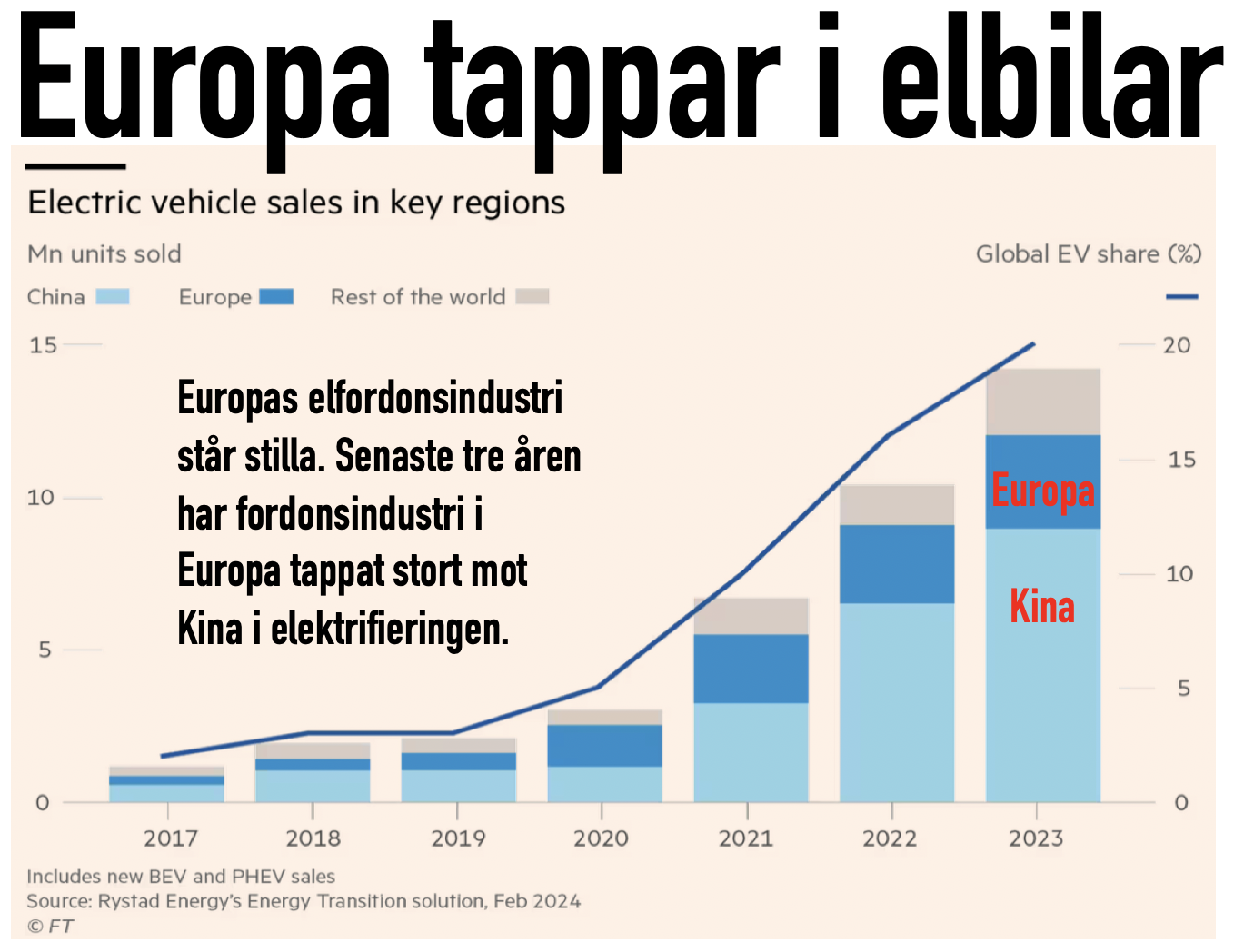 Sedan pandemin har Europas elektriska fordonsindustri stått stilla. När Kina kör full gas. Vi gör våra 3 m el-fordon varje år. Under tiden har Kina ökat femfallt. Från 2 till 10 miljoner fordon. Hur vi ska klara konkurrensen från bagageluckan kan bli mer läskigt än spännande. Mer om elektrifieringen.