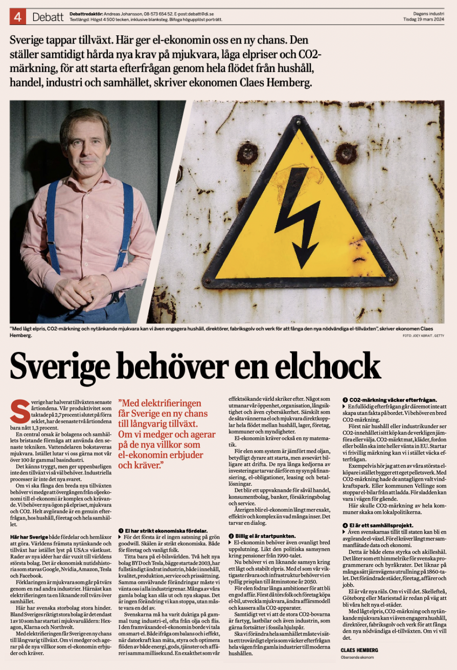 Sverige har tappat tillväxt senaste två årtiondena. Kruxet är mjukvara för att skapa affärsmodeller i realtid hela vägen från industrin, hushåll och kommuner. Nu ger oss el-drivna ekonomin oss en ny chans. Genom hela processer, flöden, mäta, styra och optimera för ny tillväxt. Skriver jag i Di debatt. Mer om EL-EKONOMIN.
