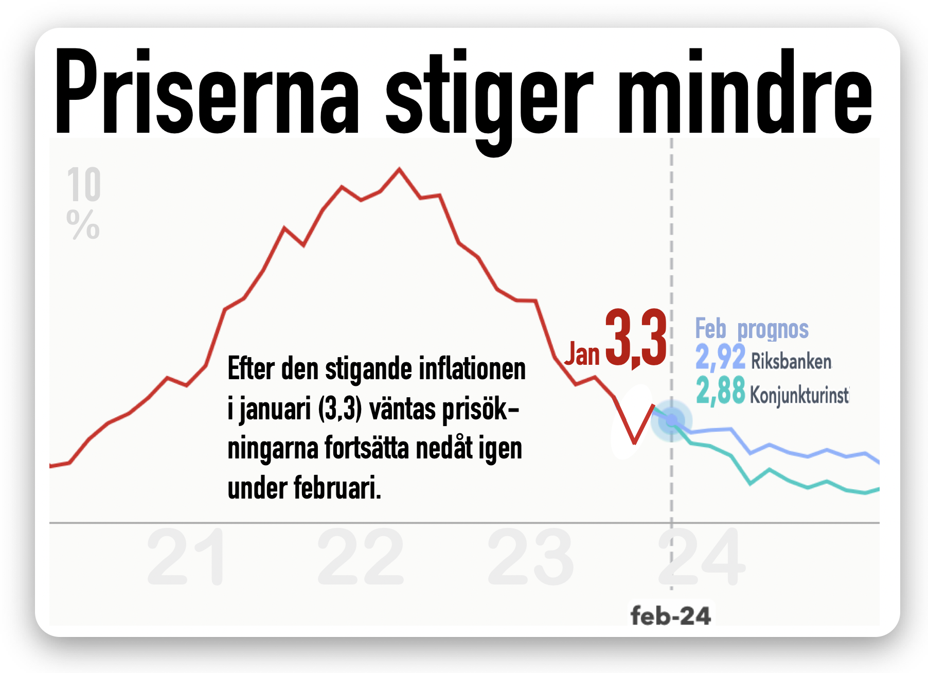 Efter ett tillfälligt tick upp i prisökningar, nu svänger inflationen ned igen. Bara 2,6% väntas på torsdag. Och sedan fortsätter priserna ned. Med maten som surt piller. Redan i juni kan vi vara under målet 2%. Läs mer