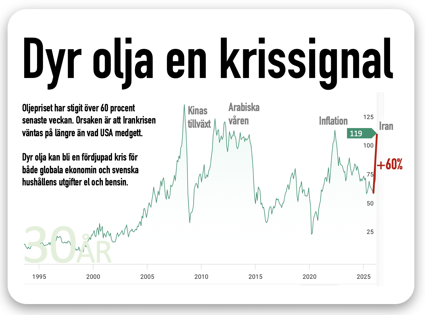 Oljan steg till 119 dollar under natten. Orsaken är att Irankonflikten ser ut att bli mer långdragen. För svenska hushåll ger det dyr el och bensin här i mars. Även lågkonjunkturen kan förlängas och asiatiska börser reagerar kraftigt nedåt. Läs mer