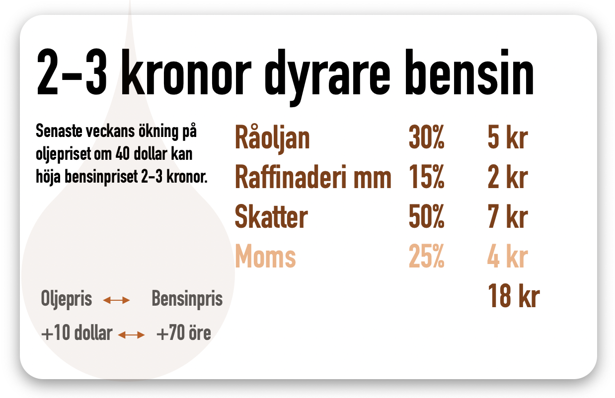 Att oljepriset stiger från 70 till 110 dollar kan höja bensinpriset ”bara” med 2–3 kronor. Det beror på att bara en liten del av bensinpriset utgörs av råolja. Läs mer