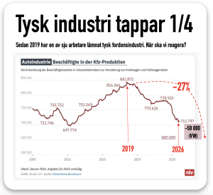 Var fjärde tysk fordonsarbetare slutar. Först tappade tysk fordonsindiustri andelar i Kina. Det var kring 2020. Senaste åren förlorar tyskarna även andelar i Europa. När ska vi i Sverige diskutera industrins framtid? Läs mer