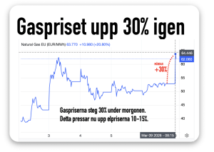 Under måndagen steg gaspriserna i Europa hela 30 procent. Detta vänta nu lyfta svenska elpriser. Särskilt i södra Sverige. Rusningen i priserna sker i spåren av nattens kraftigt stigande oljepris. Mer om oljepris, elpris och bensinpris.
