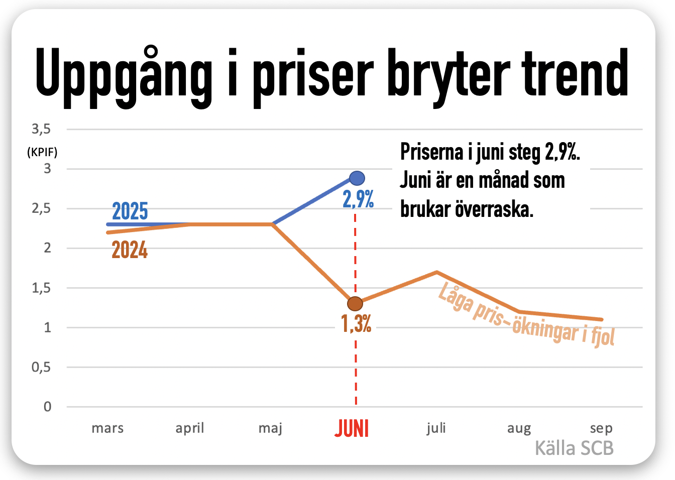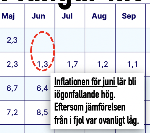 I juni steg priserna 2,9%. Men det är lugnt. För orsaken är inte så mycket årets priser, utan att fjolårets jämförelse gav ovanligt låga junipriser. Särskilt el och bensin föll i fjol. Och fortsätter ned i år. Läs mer