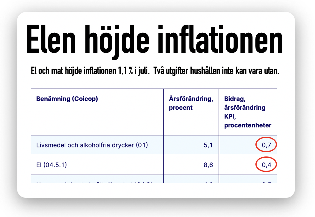 Mat och el höjde inflationen hela 1,1%-enhet bara under juli. Det är dessvärre något vi kan behöva vänja oss vid. Dessutom är de närmast utom Riksbankens kontroll. Läs mer