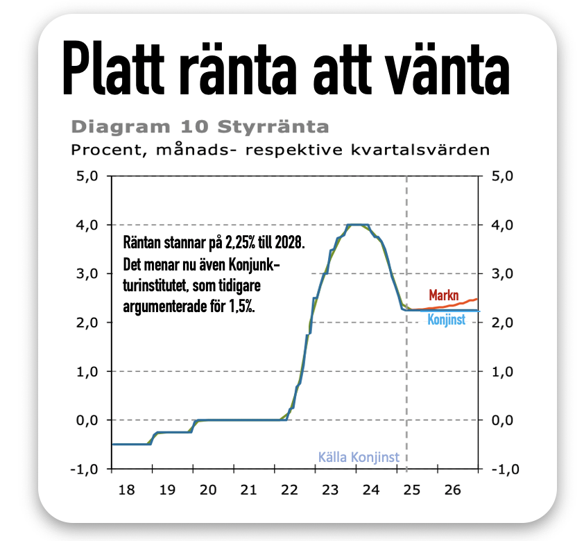 Även Konjunkturinstitutet byter fot. Nu väntar de sig 2,25 % i styrränta fram till 2028. Det är högre än tidigare. Tullar och stora investeringar i energi och försvaret hindrar lägre inflation. Läs mer
