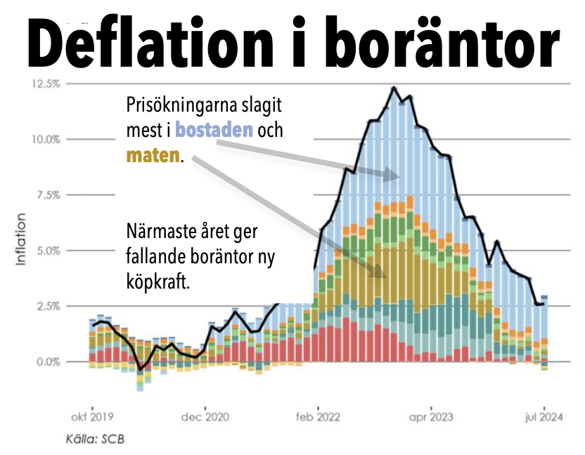 Svenskarnas sargade köpkraft kan snart återvända. Orsaken är fallande boräntor. Senaste årens värsta inflatören – boräntorna – kan därmed bli en glad deflatör.