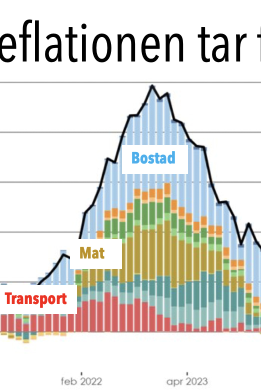 Uppgången, som synligt startade med transport/energi (rött), togs snart över av matpriserna (brunt), och till sist gick boräntorna (blått) upp och dominerade hela inflationen. Nu när de andra faktorerna har sjunkit kraftigt, återstår det stora prisfallet på boräntor.