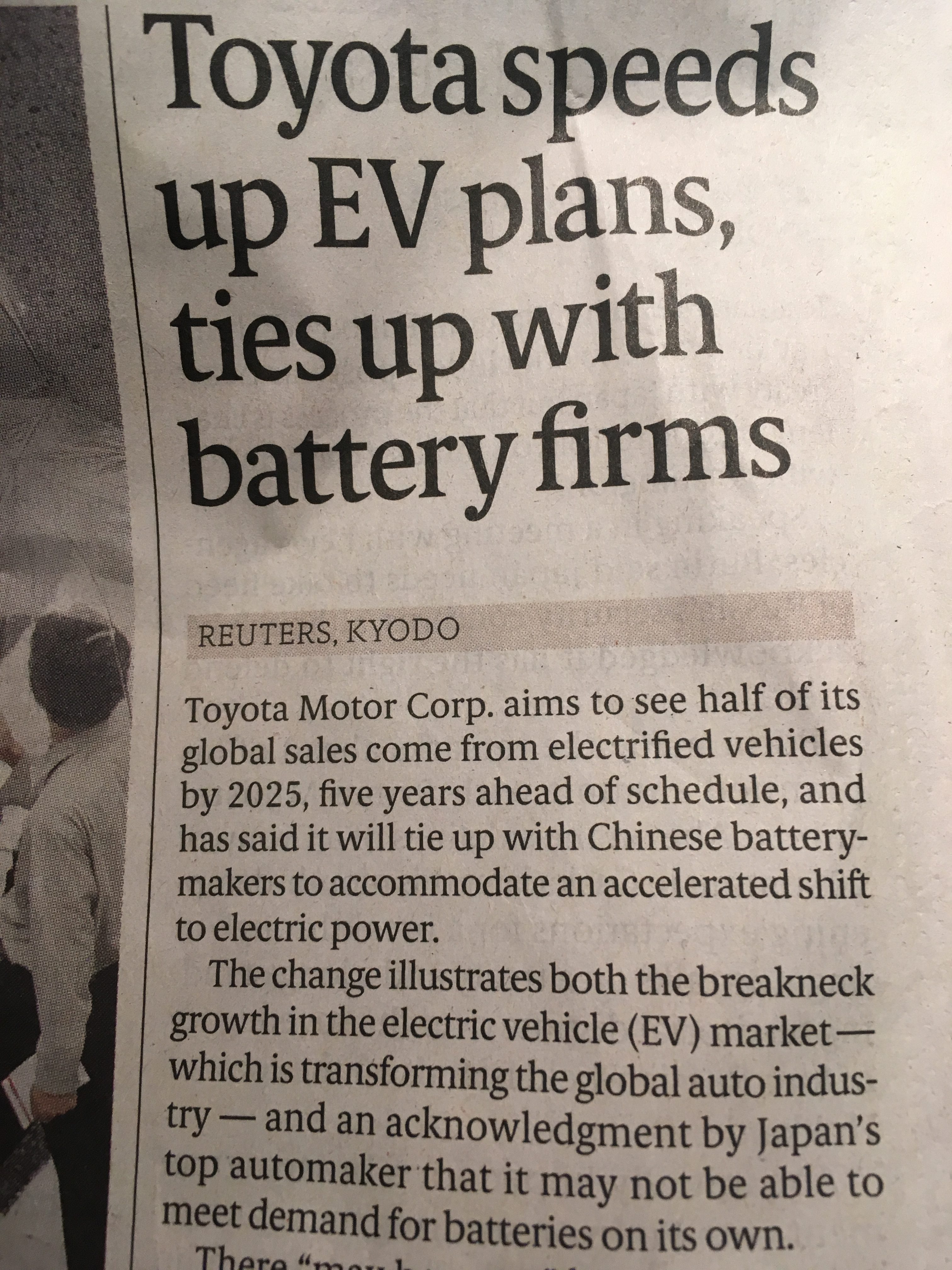 Då begriper vem som helst att såväl Toyota som Volkswagen – världens två biljättar – nu säger att varannan ny bil drivs av el redan inom fem år.
