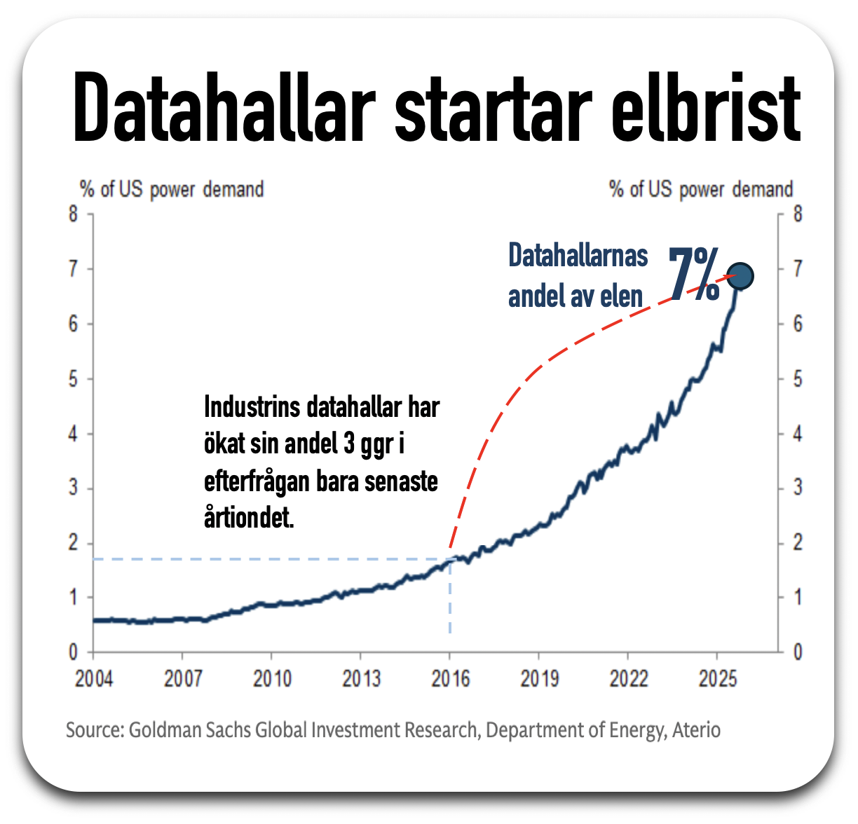 Den starkaste efterfrågan märks från datahallar som redan står för 4-10 procent av elanvändningen i USA. Och efterfrågan växer starkt.