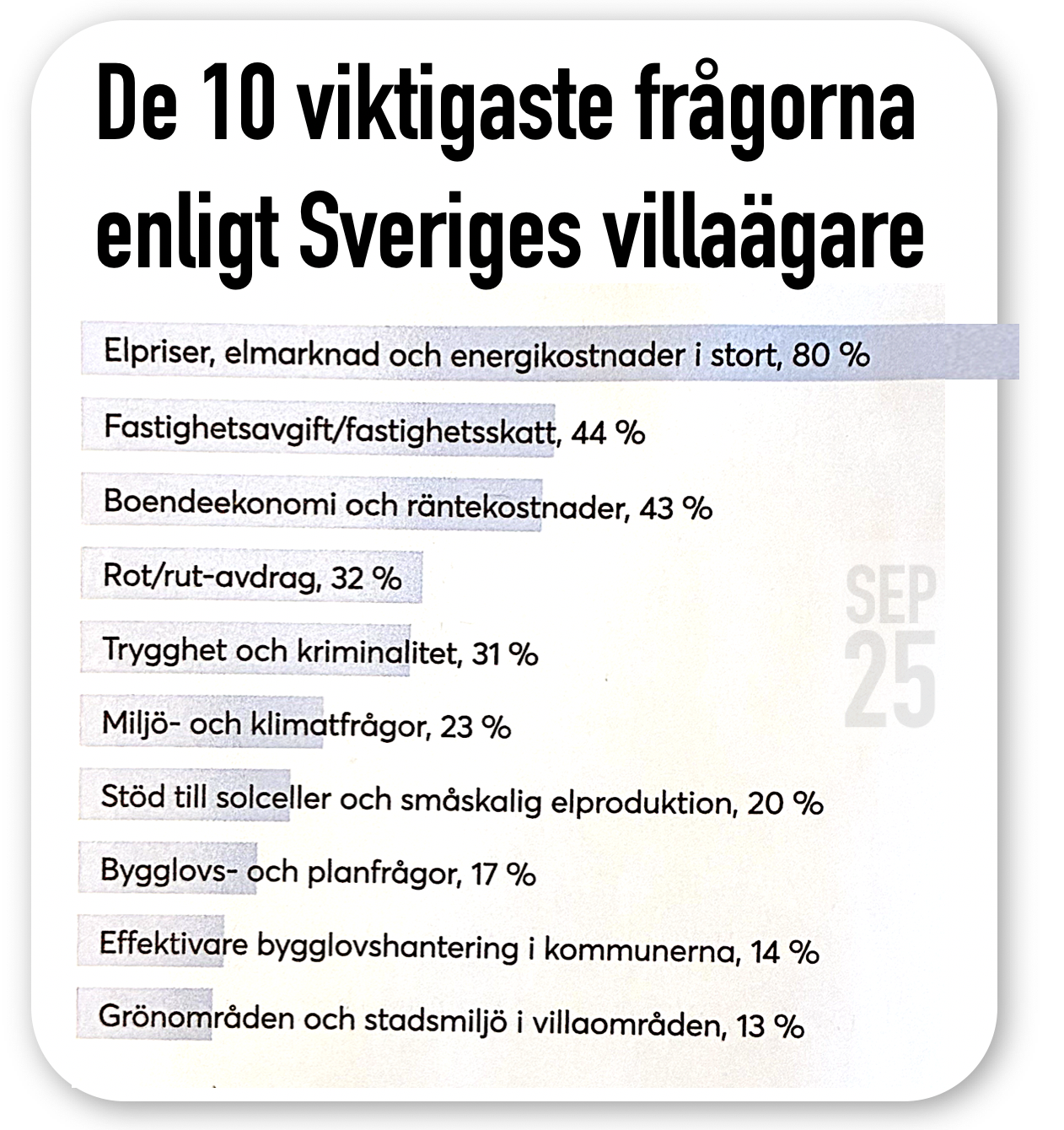Elpriser är villaägarnas största fråga idag. Det anser 8 av 10 som bor i villa, visar aktuell undersökning.