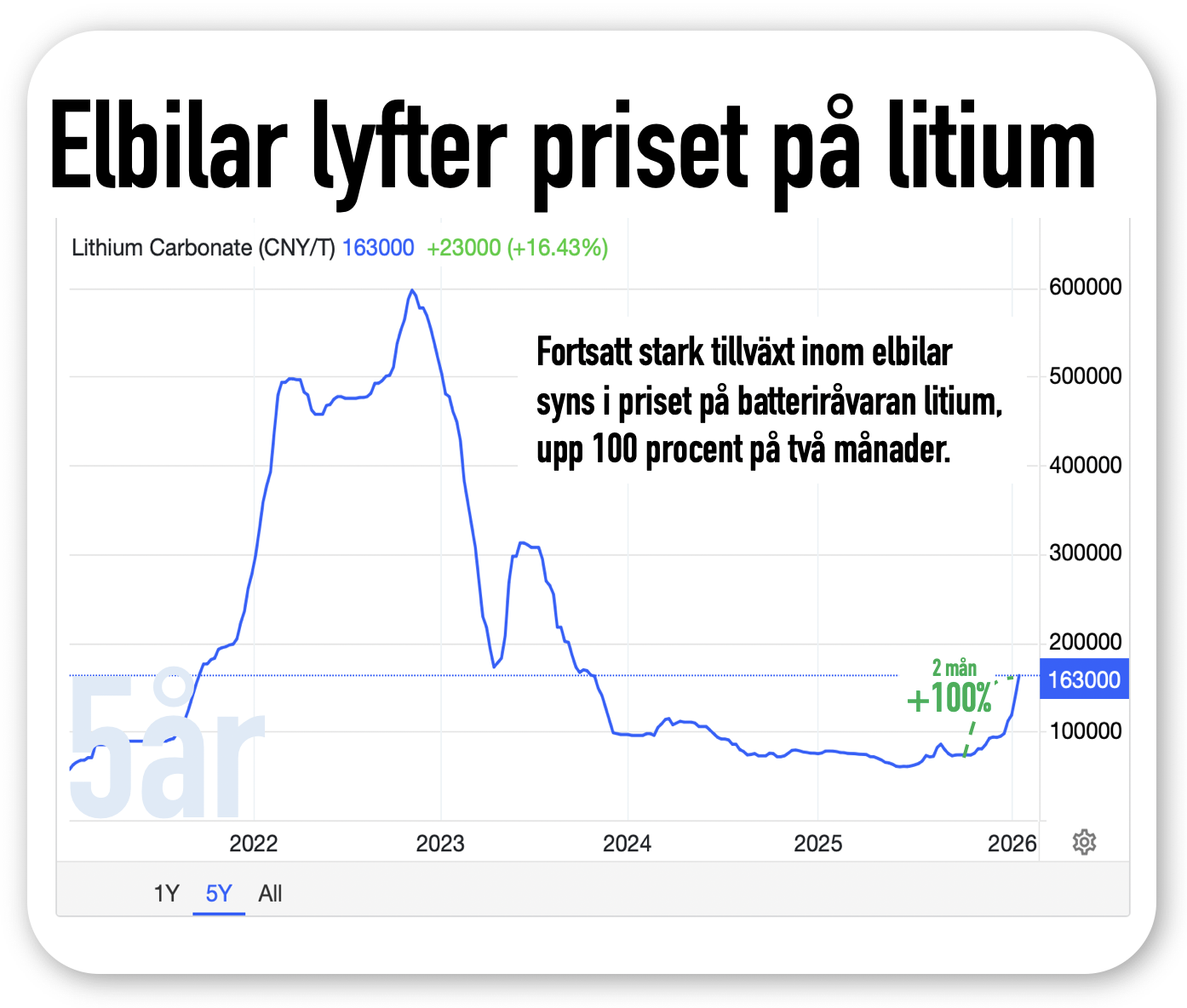 Elbilar pressar ned oljepriset och lyfter batteriråvaran litium. Senaste två månaderna dubblas priset, efter väntade 18 miljoner nya elbilar 2026. Samtidigt pressas batteripriserna –8% i fjol, diskuterade vi på EFN.