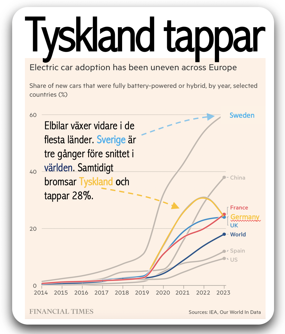 Hem » Elbilar växer saktare 2024-11-25 Elbilar växer saktare Elbilar växer vidare, om än 6 procent långsammare i år än i fjol. Det märks mindre i Sverige där 6 av 10 bilar är el eller hybrid. Andra länder drabbas hårdare. Tyskland har tappat hela 28 procent. Det påminner oss om den tyska industrikrisen.