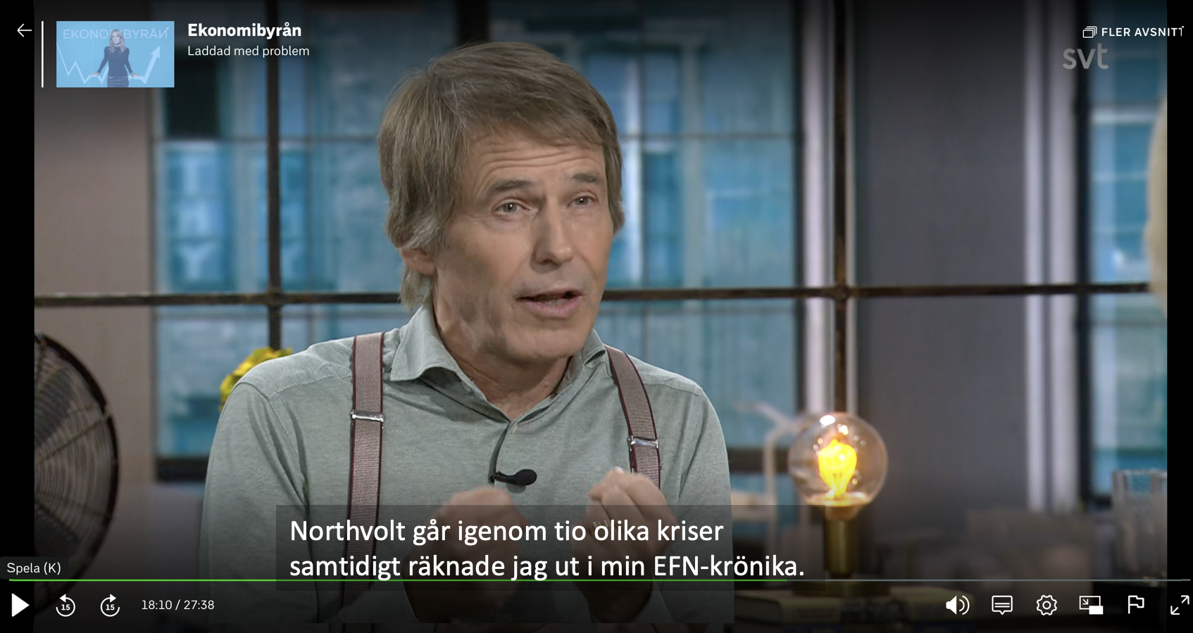 Elbilar och batterivärlden går just nu igenom tio olika kriser samtidigt. 2025 vänder det till medvind. Tack vare piska och morot (krav och subventioner). Diskuterade vi på Ekonomibyrån i SVT.
