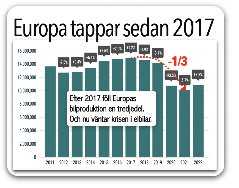 sälja bilar i Kina hösten 2028. Det är illavarslande eftersom försäljningen där stått för en ansenlig del av bolagens vinster. Scenförändringen bäddar för en bred svår kris i europeisk bilindustri.