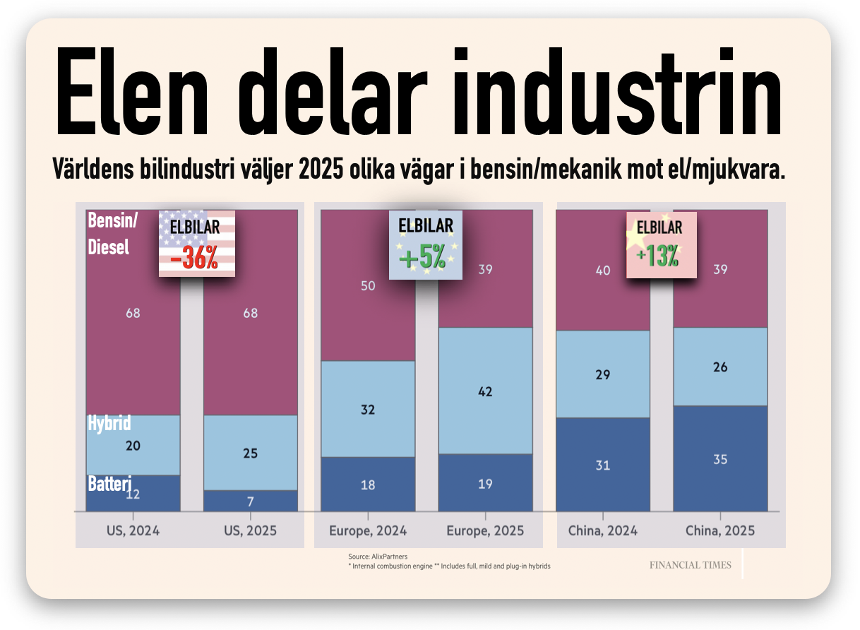 Bilindustrin i USA, Europa och Kina väljer tre olika vägar i fråga om el och mjukvara. Det påverkar våra möjliga val i energi, ekonomi och teknologi.