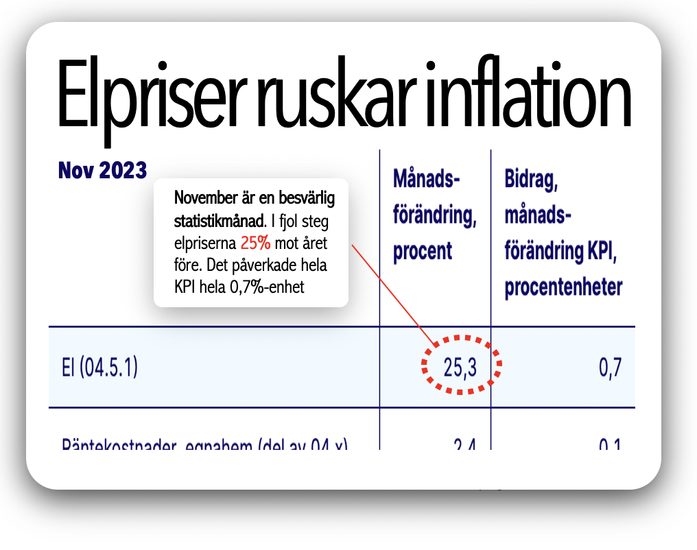 Bilden av inflationen i hela samhället blir lite hoppig så här på hösten. Orsaken är vädret. Kallt väder och lite vind ger oss dyr el. Och el är en allt större del av våra utgifter.