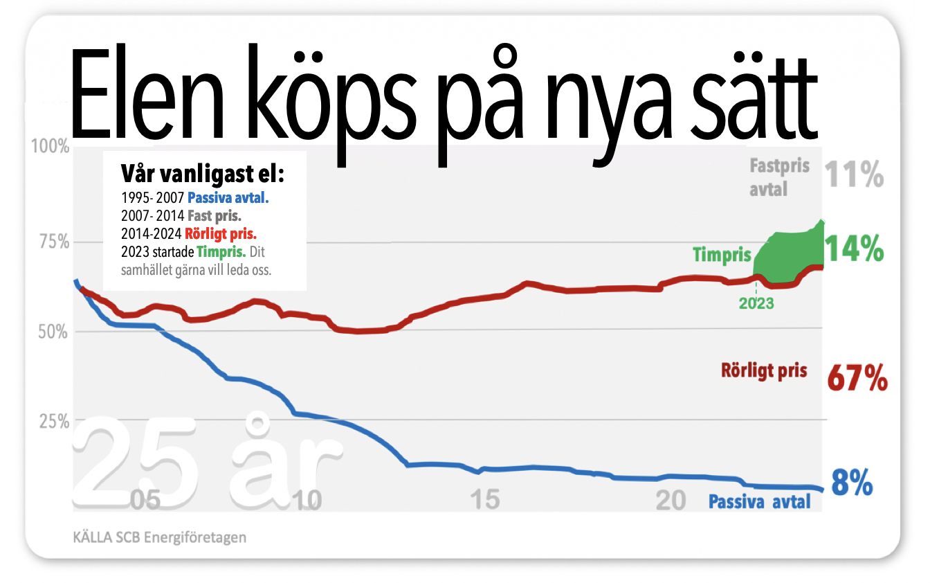 Sedan 2023 växer timavtal klart snabbast. Vad är det alla olika avtalen försöker säga oss? Jo, samhället vill att fler väljer timavtal om vi ska klara vår elektriska framtid.