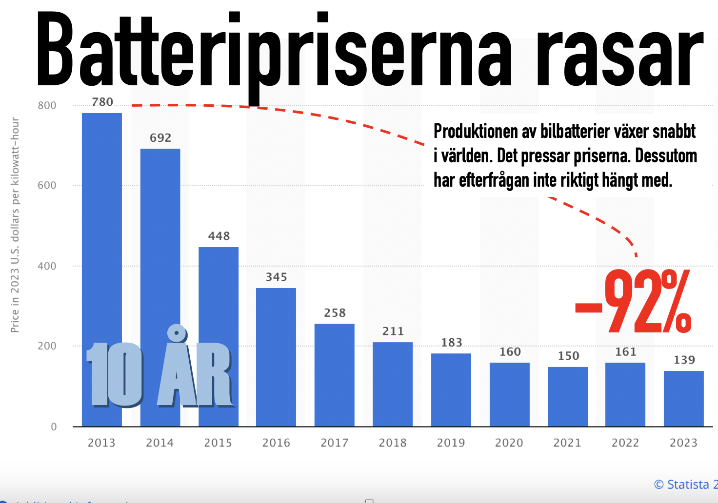 Senaste fem åren har satsningarna på batterier och elnät fått högt tempo internationellt. Sverige däremot har precis börjat. Trots att batteripriserna är ned 92% senaste årtiondet.