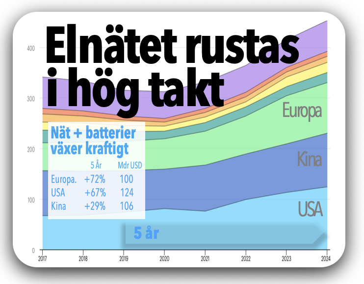 Tittar vi internationellt så är utvecklingen av nya elnät och stödjande batterier på god fart. Visar siffror från internationella energiorganet IEA. Senaste fem åren har Europa ökat satsningarna mest, eller hela +72%. USA ligger strax efter med +67%. Medan Kina växer lugnare med endast +29%.