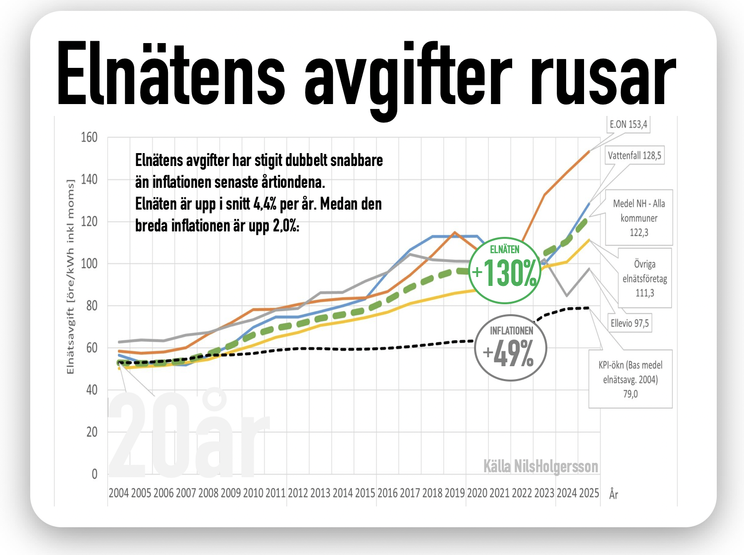 De snabba prisökningarna är dessutom långt över snittet de senaste årtiondena. Då har priserna för elnäten stigit med 4,4 procent per år. Det är mer än dubbelt så höga som priserna i hela samhället, som under samma period ökat med 2,0 procent per år.