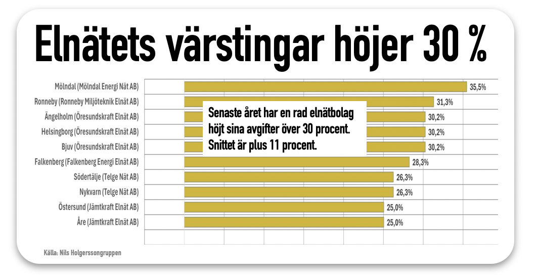 De senaste åren har vi sett priserna för elnät sticka iväg både 10 och 20 procent på bara ett år. Snittet i Sverige har de senaste åren legat kring 10 procent per år, visar NilsHolgersson. Det är prishöjningar som särskilt sticker oss i ögonen, eftersom vi inte kan byta elnät. Det är ju ett monopol.