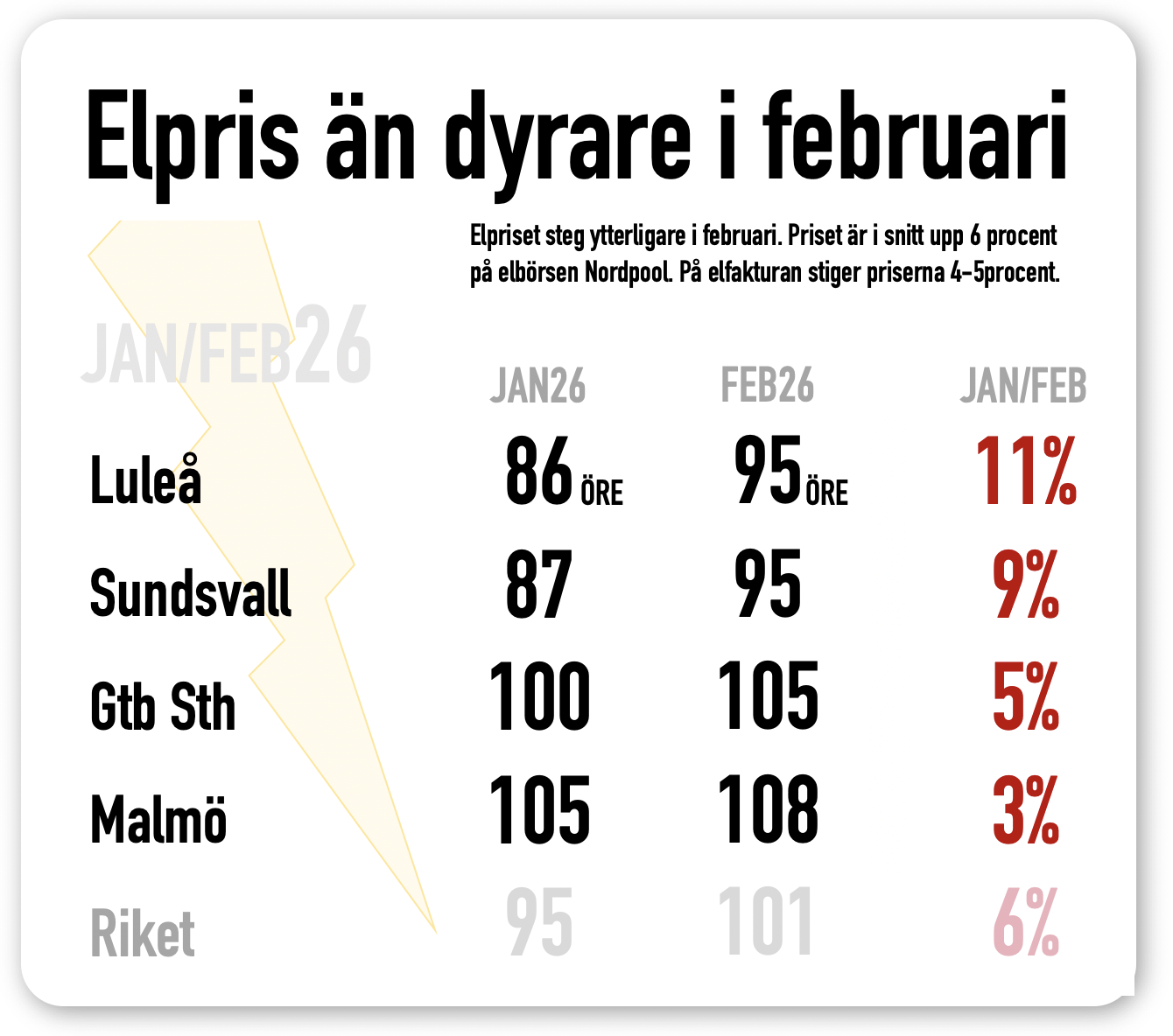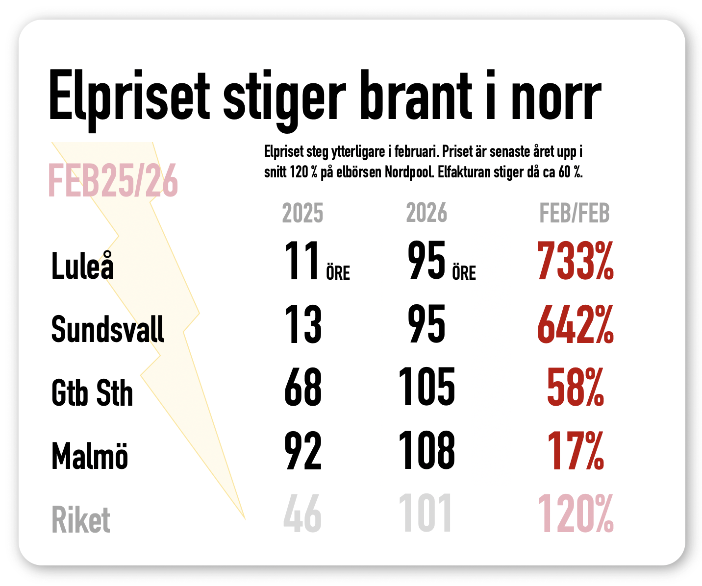 I februari steg elpriserna mest i norr. Där steg priserna 9–11 procent jämfört med månaden före. Jämfört med februari i fjol steg priserna upp från 11 till 95 öre. Det är en uppgång med enorma 700 procent.