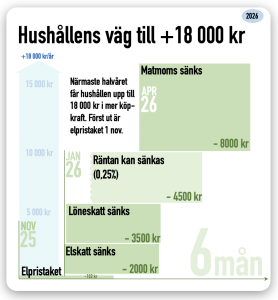 Redan vid årsskiftet får vi lägre elskatt och lägre löneskatt. De ger hushållen 2 000 respektive 3 500 kronor i snitt under hela 2026. Sedan väntas räntan sänkas ytterligare med 0,25, och sist men också störst, sänks matmomsen.