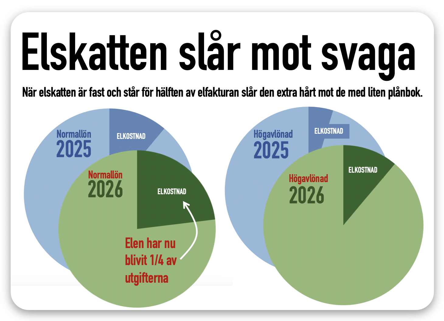 Kruxet är att elskatten slår mot dem med minst inkomst och samtidigt mot den del av samhället som väntas växa mest de närmaste åren, när allt mer energi hämtas från el. Och vi samtidigt använder betydligt mer el.
