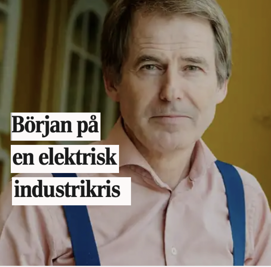 Vår elektrisks kris syns redan halverad försäljningen av bilar till Kina. Deras moderna industri har vi svårt att möta. Om vi inte ändrar vårt arbete kring el, mjukvara, automation och AI, skriver jag i Di debatt. Här mer om elkrisen.