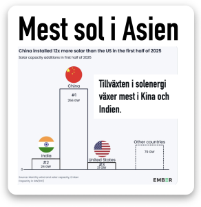 Tittar vi på antalet monterade solpaneler finns återigen ett land som leder stort. Hela 12 gånger mer nya paneler syns i Kina jämfört med tvåan och trean som är Indien och USA.