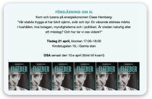 Turnén om vårtids elfeber når nu Stockholm. Utifrån boken med samma namn: I fokus är den nya elen inverkan på vardag och ekonomi för hushåll och samhälle. I skuggan av elkris, oljekris och inte minst ekonomisk oro… Delta 21 april. Anmälan här.