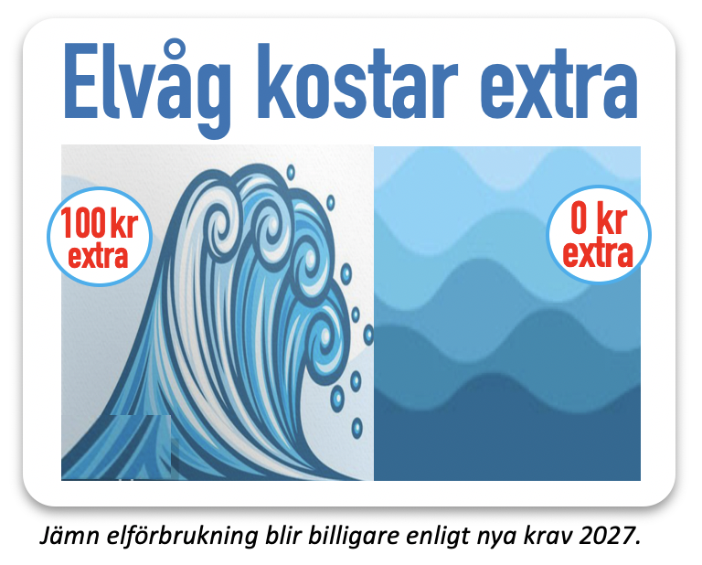 Det enkla rådet är ”välj jämnförbrukning”. Utan svallvågor med el. Och undvik ”en stor elvåg” där du använder mycket el samtidigt. För det kräver tjockare kablar. Eller större säkring på elskåpet om du så vill. Här ger många bolag fantastiskt krångliga förklaringar. Ett nätbolag gör tvärtom.