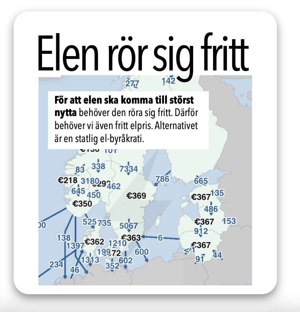 Vi talar om en elproduktion som sker med väldigt olika förutsättningar. Vinden växer. Kärnkraft startar om. Vattenkraften är billig men svårflyttad. Om staten ska sätta ett pris krävs en enorm elbyråkrati”. Oss alla.