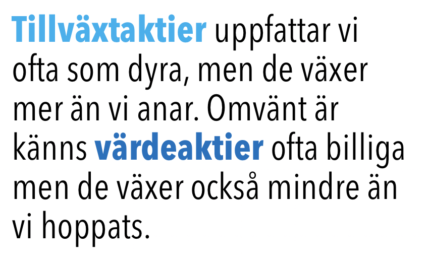 Det försiktiga värdebolagen samtidigt har utvecklats långsammare. De kommer snart bättra sig. Eftersom räntorna världen över är så låga. Då kommer vi att se köpare gå in även här.