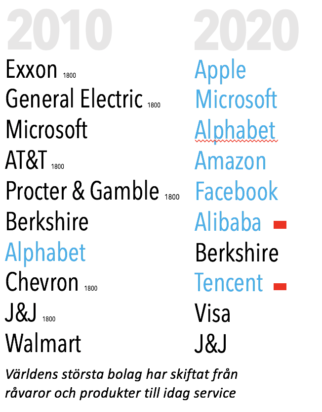 Men värdeaktierna har ett tydligt tak. De har svårt att springa ikapp tillväxtaktierna, som växer så enormt mycket mer. Titta bara på USAs största bolag senaste 20 åren (till höger). Skiftet har pågått länge.-