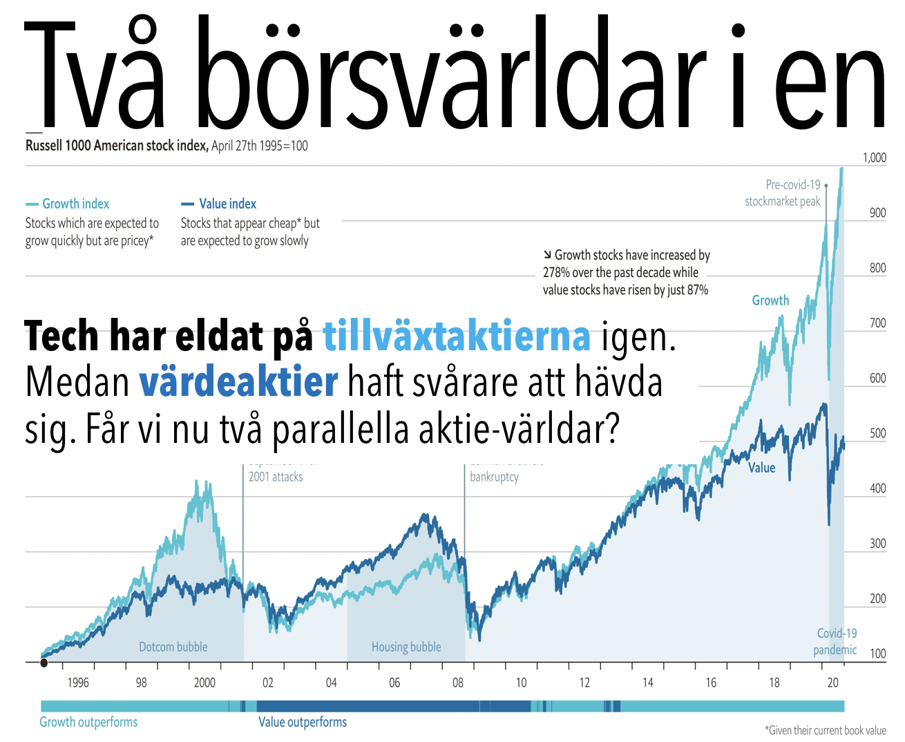Pandemin kommer att leva kvar – som året för det stora teknikskiftet. Det var då techaktier fick sin historiska renässans. Medan värdeaktierna hamnade i skuggan. Men kan bilden hålla i sig? Ja och nej. I en mer tudelad aktievärld behövs bägge.