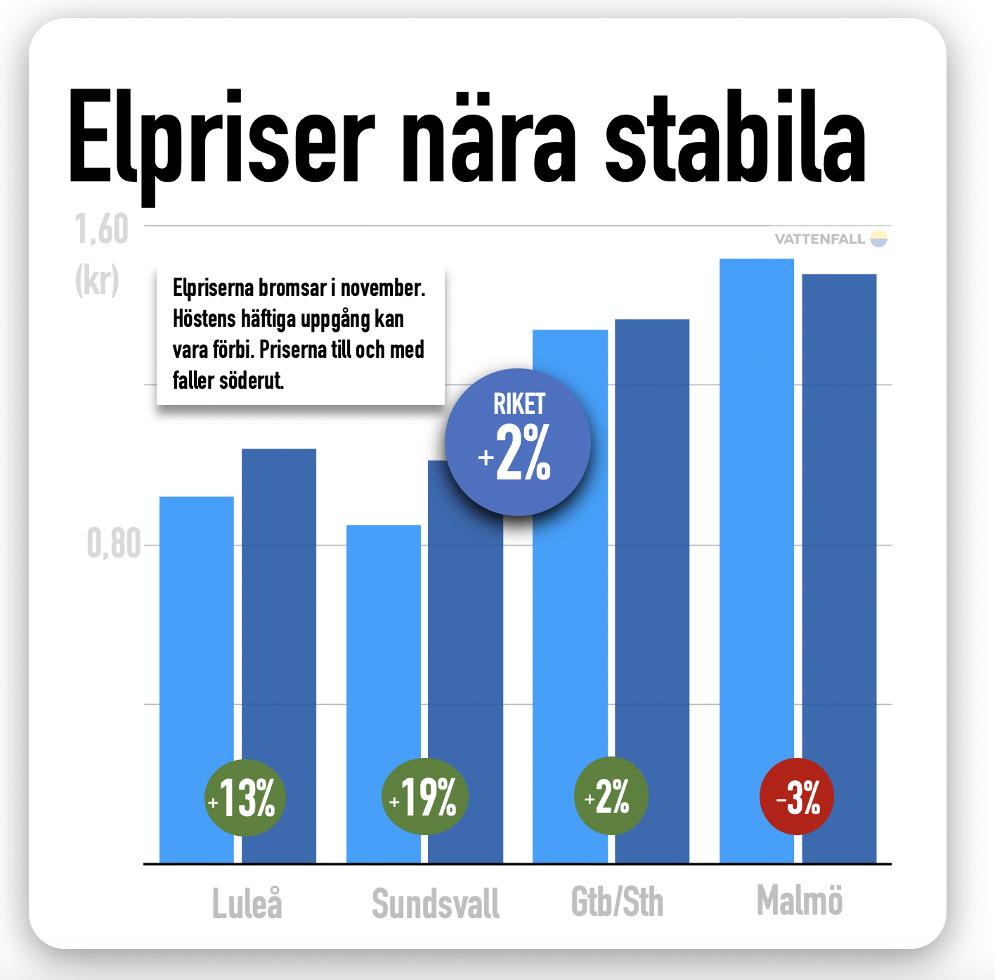 Södra Sverige fick se mest stabila elpriser under november, medan norra Sverige har fått fortsatt högre elpriser. Totalt sett dämpades ändå priserna kraftigt, som under hösten stigit över 20 procent.