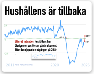 Efter 42 månader ute i kylan är hushållen tillbaka. Deras syn på sin egen ekonomi är för första gången positiv igen. Det sammanfaller med sänkt elskatt, löneskatt och matmoms.