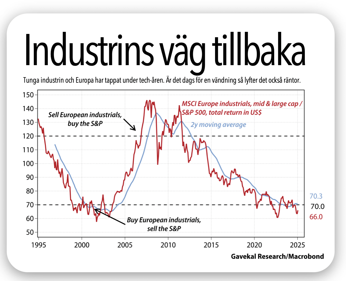 Industrin är påväg tillbaka. Nysatsningar märks i energi, infrastruktur och försvaret. Det kan lyfta räntorna, resonerar Gavekal. Frågan är bara om industrin har förmågan att matcha den ny industrin från Kina. Just nu finns anledning att tveka.