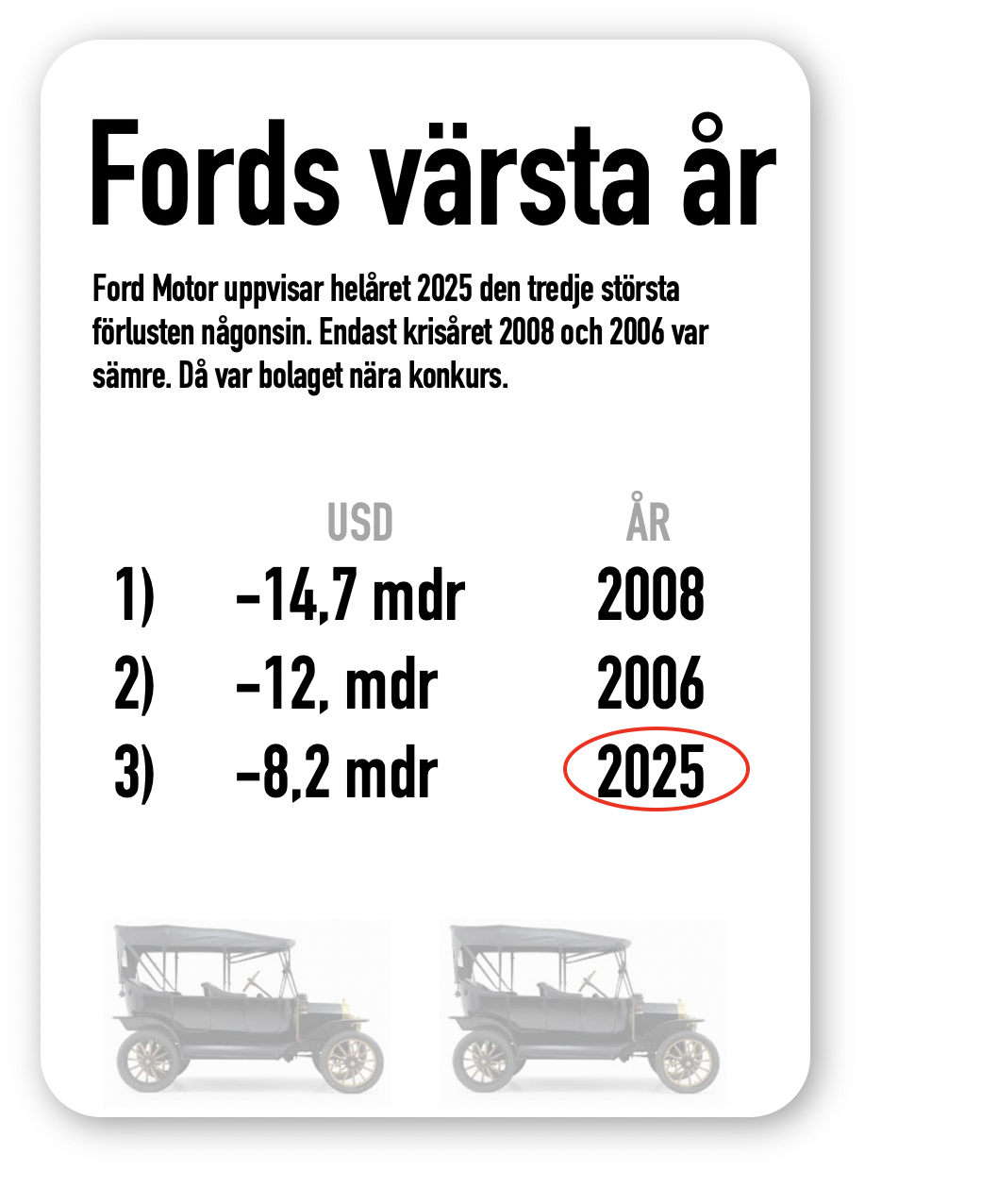 Samtidigt visar Ford nu den tredje största förlusten i historien. Bara krisen under bankkraschen 2008 var värre. Då var bolaget mycket nära att duka under.