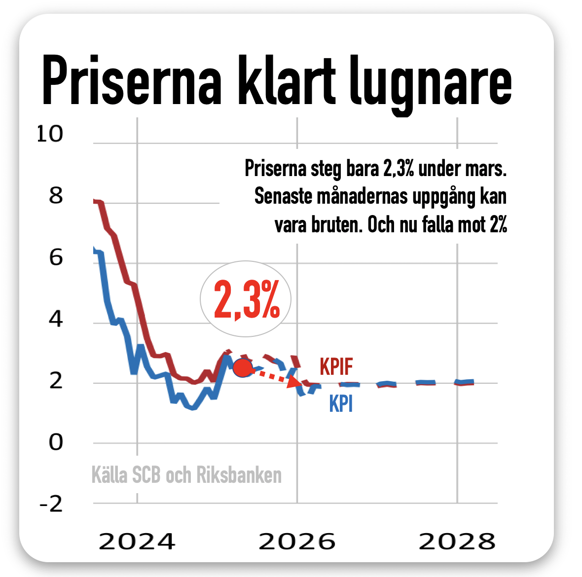 I stället sjönk inflationen i mars till 2,3 %. Här får vi hjälp av allt från fallande energipriser till en starkare krona. Den globala lågkonjunkturen pressar ner energipriserna. Och kronan väntas fortsätta stärkas.
